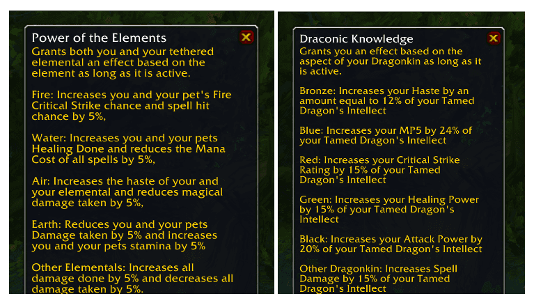 Tamed Pets are a great way to be unique amongst the Heroes of Azeroth! With hundreds of options between tamable Beasts, Demons, Undead, Dragons, and Elementals, there’s certainly a lot to choose from. However, the two newest additions to the party–Tamable Dragons and Elementals–lacked support to bring them up to the strength of other tamable pets. Two new talents arrive to lessen that gap, granting power to tamed Dragons and Elementals in unique ways.