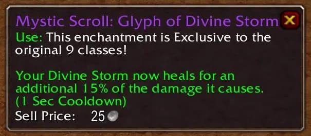 [Exorcist's Slash] - Transforms your Heroic Strike into Exorcist's Slash. Exorcist's Slash deals 260% weapon damage(reduced damage against players) and reduces the cooldown of your Crusader Strike, Divine Storm or Judgement. This ability requires Art ofWar to be used and scales with modifiers to Exorcism. It can trigger Sanctity of Battle and Righteous Vengeance.