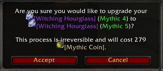 Sometimes the item you want doesn’t drop: that’s okay! Each time you complete a Mythic+ dungeon, you’ll receive Mythic Coins. These coins can be used to upgrade Mythic items. This means that you can delve into Mythic 0 dungeons to find the items you want, then upgrade them with your coins up to the highest level of Mythic+ you’ve completed. With every Mythic+ you complete, you’re getting coins you can use to empower items you find.