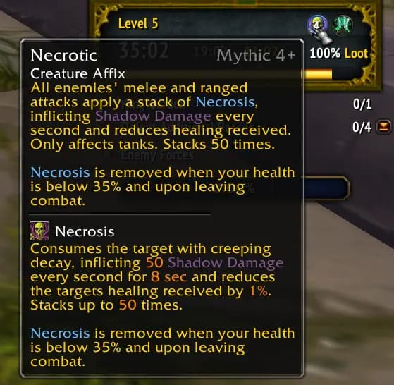 However, it’s not so easy to defeat these dungeons: Mythic+ dungeons have weekly rotating AFFIXES–additional effects that change how you interact with these dungeons.