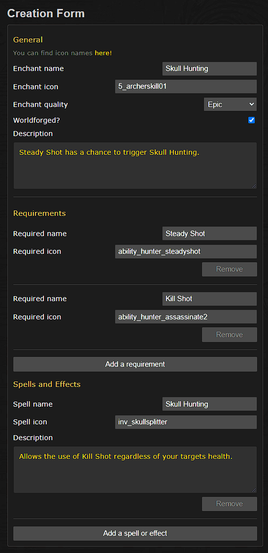 With the new database, Heroes will be able to prototype and share their own custom Mystic Enchantment ideas. The Mystic Enchantment Creator lets you theorycraft mock-up Mystic Enchantments and see them as a tooltip. This includes support for thousands of custom icons to give your Mystic Enchantment a unique look. Once you’ve got yours created, you can share it with the community!