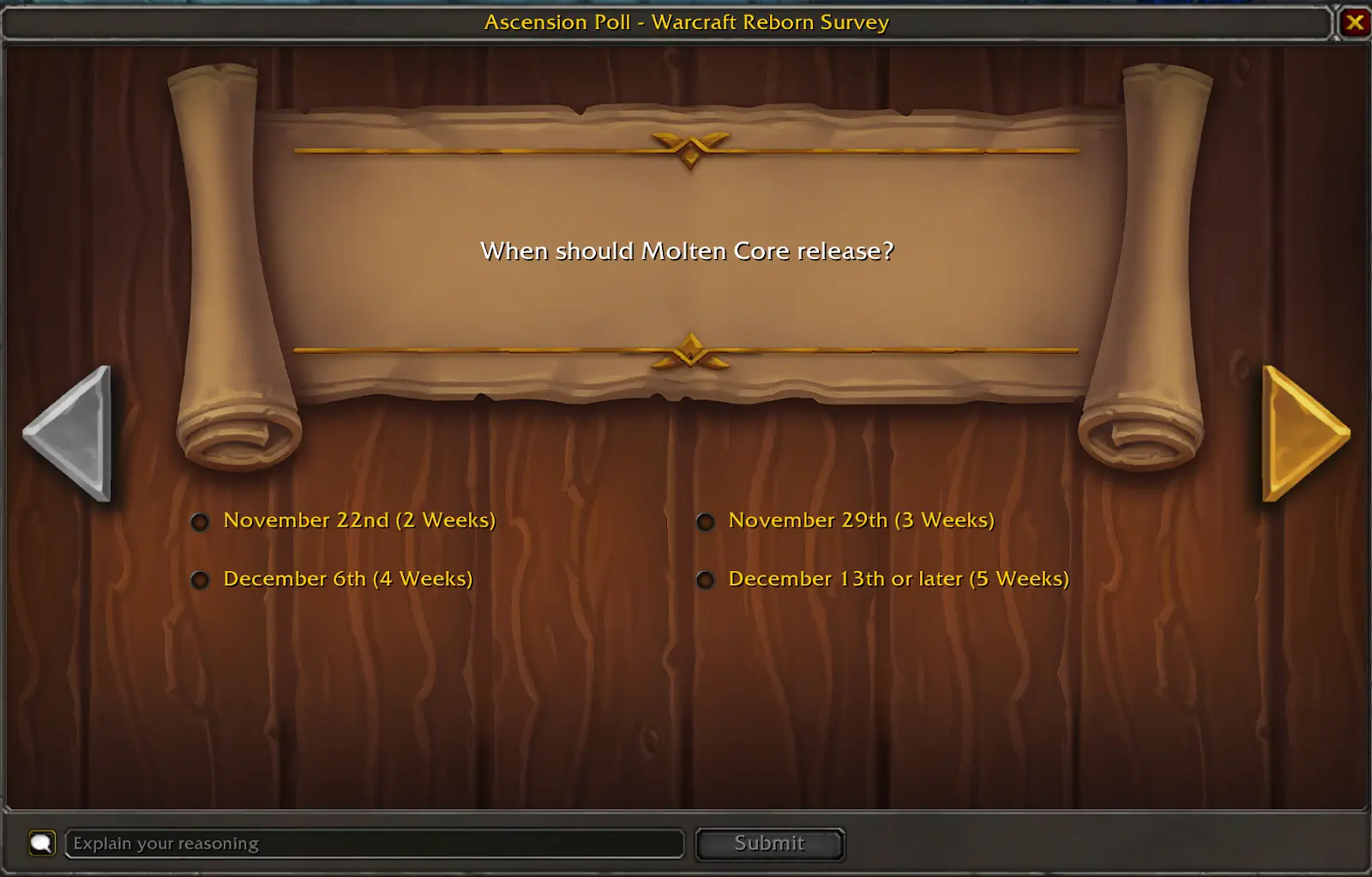 There is currently a set of 5 questions live on Bronzebeard and Malfurion for you to answer about content release cadence, release dates, pvp modes, phasing, merges, and experience potions you can login now to give your input!
